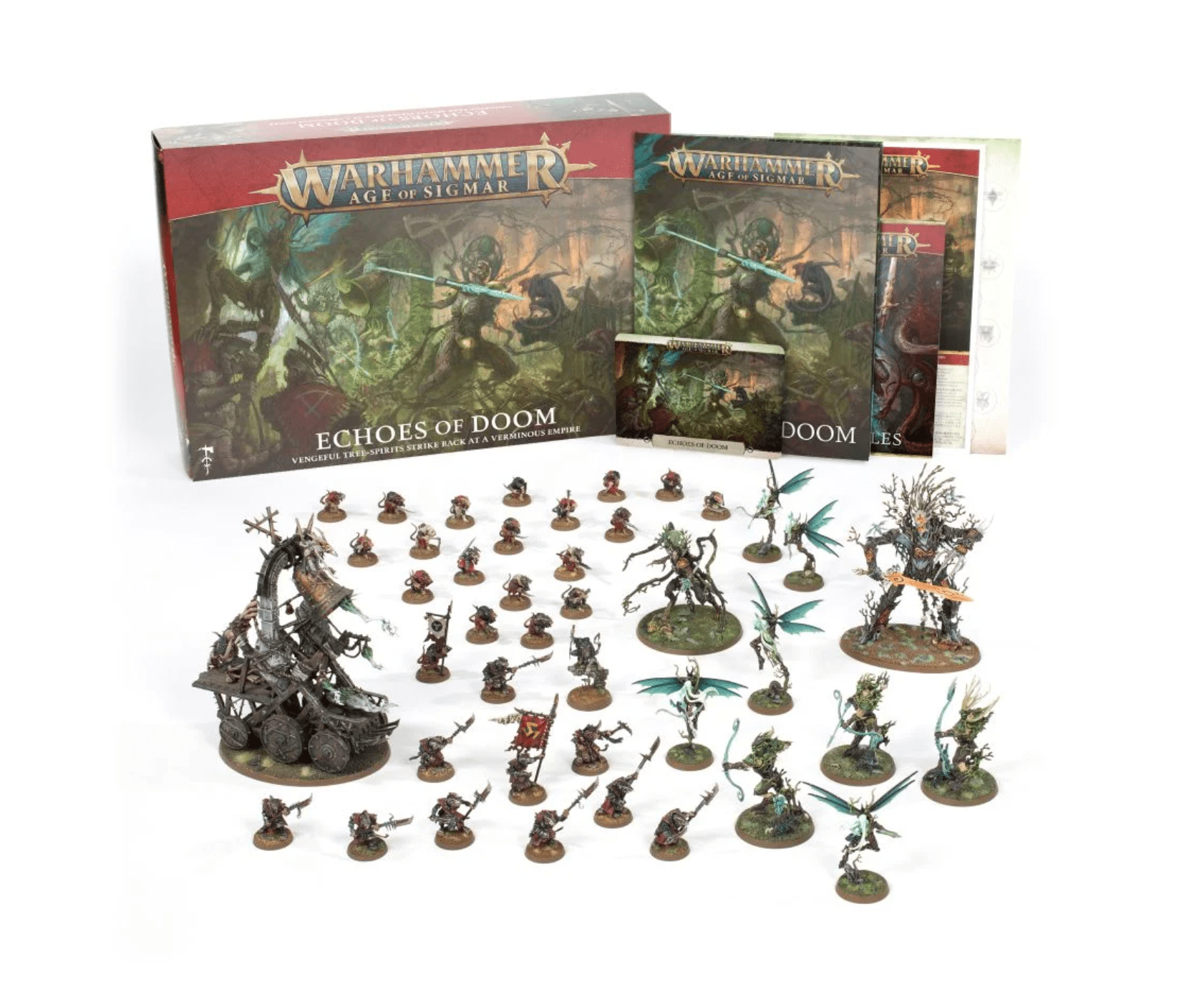 In this box, you will find all the Citadel miniatures you need to play out the brutal conflict between the vengeful Sylvaneth and the thieving skaven. Alongside these two armies you will find a book of detailed background information on the narrative of Echoes of Doom and the two factions involved. Also included are warscrolls and battleplans that allow you to start playing with your new armies right away, as well as extra rules content such as Region of War: The Adamantine Chain, Aqshy.